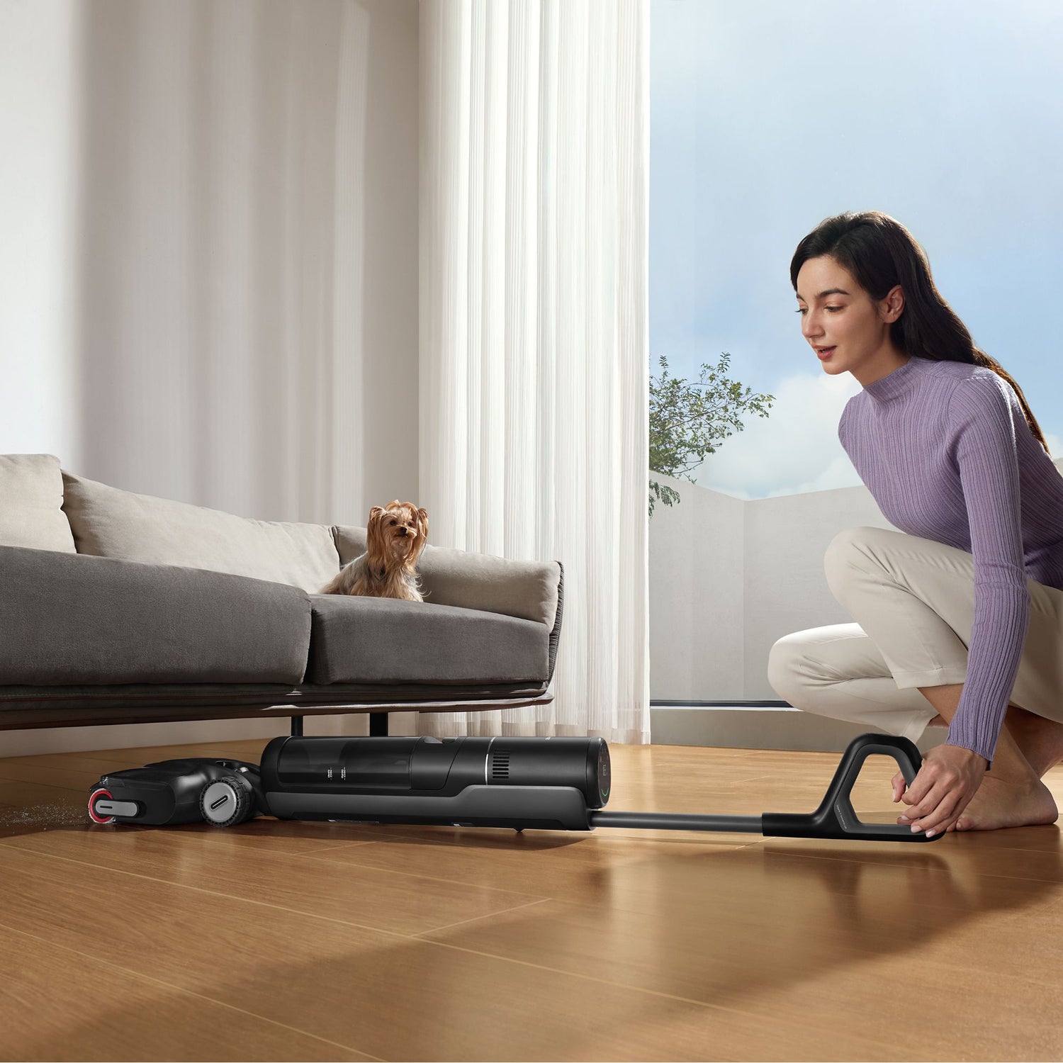H12 Pro FlexReach boasts a biomimetic design that effortlessly conforms to the floor, allowing its body to fit into spaces as low as 14 cm and its brush head into spaces as tight as 9.6 cm. It's innovative rotating axis ensures smooth navigation through narrow areas, while the omnidirectional wheel at the back prevents scratches on rear surfaces.